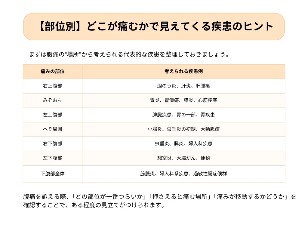 腹痛だけでは判断しづらいときは、ほかの症状とセットで考えることが重要です。