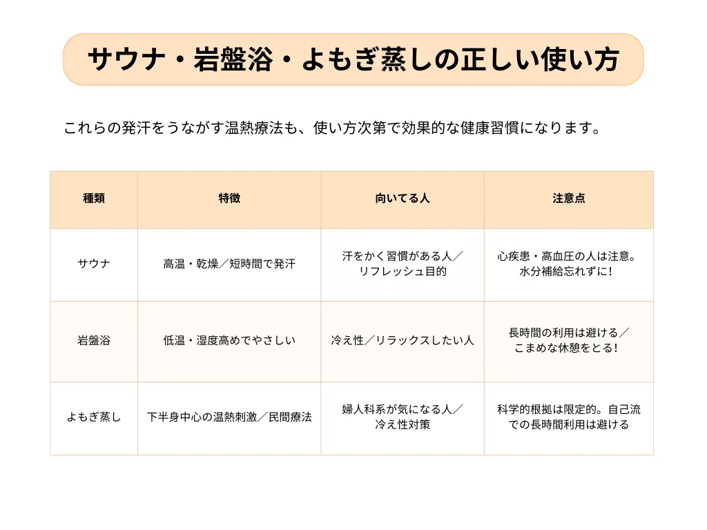 どれも「たくさん汗をかけば体にいい」というより、「心地よく汗をかくことを習慣にする」のが大切です。