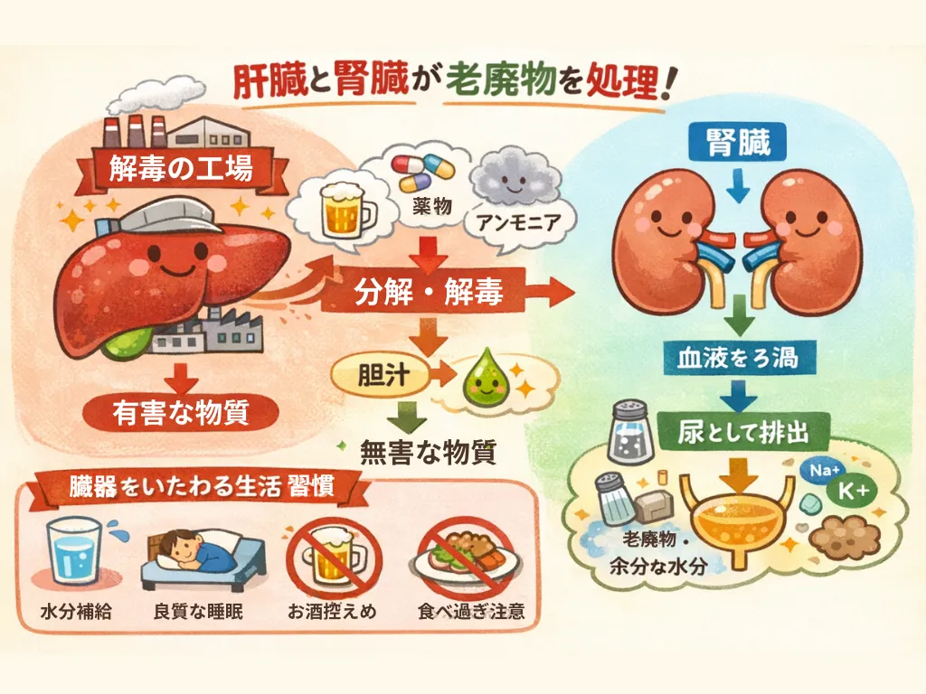 実際に私たちの体内の老廃物や有害物質を処理・排出しているのは、主に「肝臓」と「腎臓」です。
