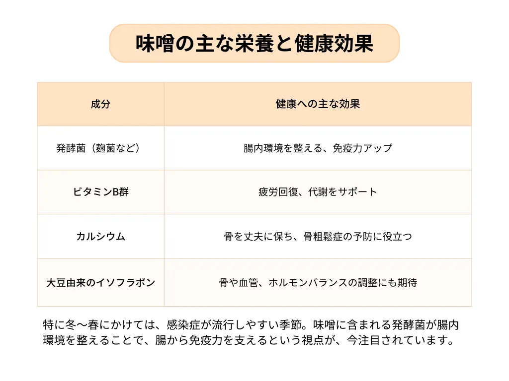発酵食品である味噌には、腸内環境を整えたり、免疫力をサポートする働きがあることが、