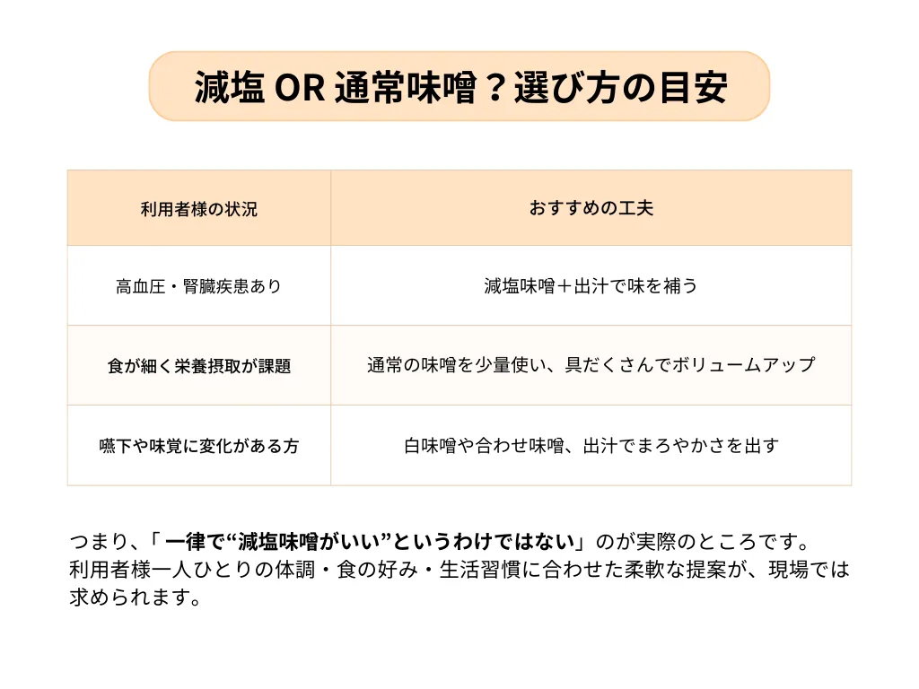減塩タイプの味噌や、白味噌(甘みがあり塩分控えめ)を選ぶのもポイントです。